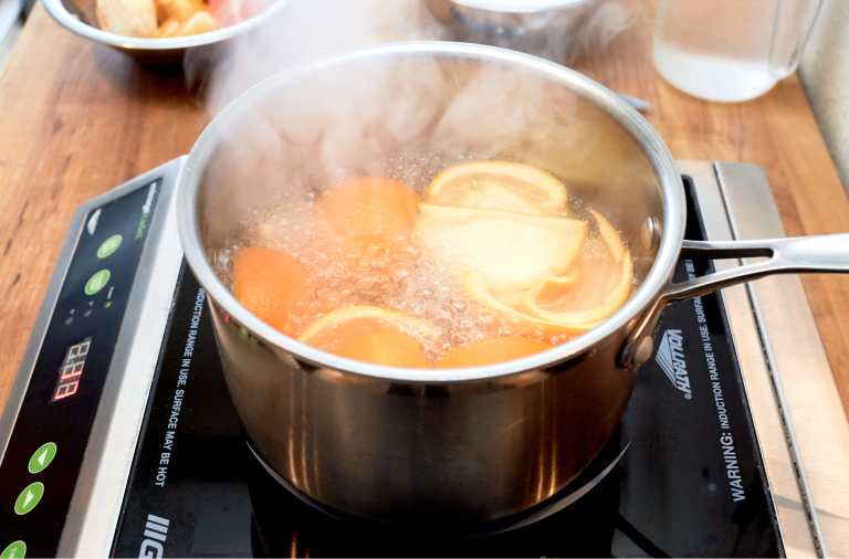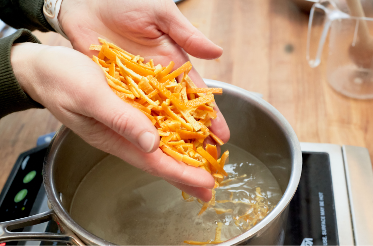 Blanch peels by placing them in a saucepan, covering with water, and boiling for 30 seconds. Drain and repeat, then let cool.