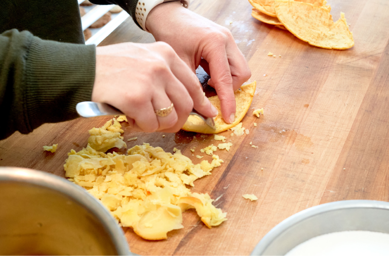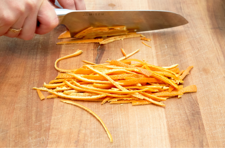 Slice the peels into thin strips (you can cut length and width to your preference here and make the peel to your unique specs).