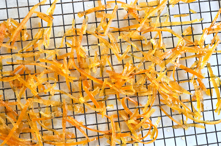 Line a baking sheet with parchment. Place a cooling rack over the lined sheet pan. Drain the peels and save the sugar syrup (keep in the fridge and add to a number of sweet treats and cocktails/mocktails). Spread the peels out in an even layer. Let dry for at least an hour, ideally leave overnight.