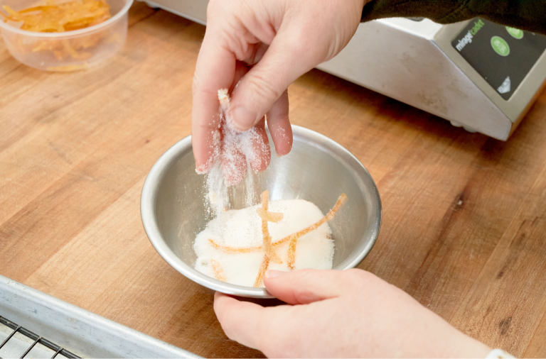 Pour 1/2 cup sugar into a shallow bowl/pan to use for coating. Add peels in batches, turning and coating the peels. This allows for easier storage as the peels do not stick together and for a sweeter finish. Alternatively, you can use the peels as-is and store them in the fridge if you prefer that deeper glossy orange, gel-like texture.