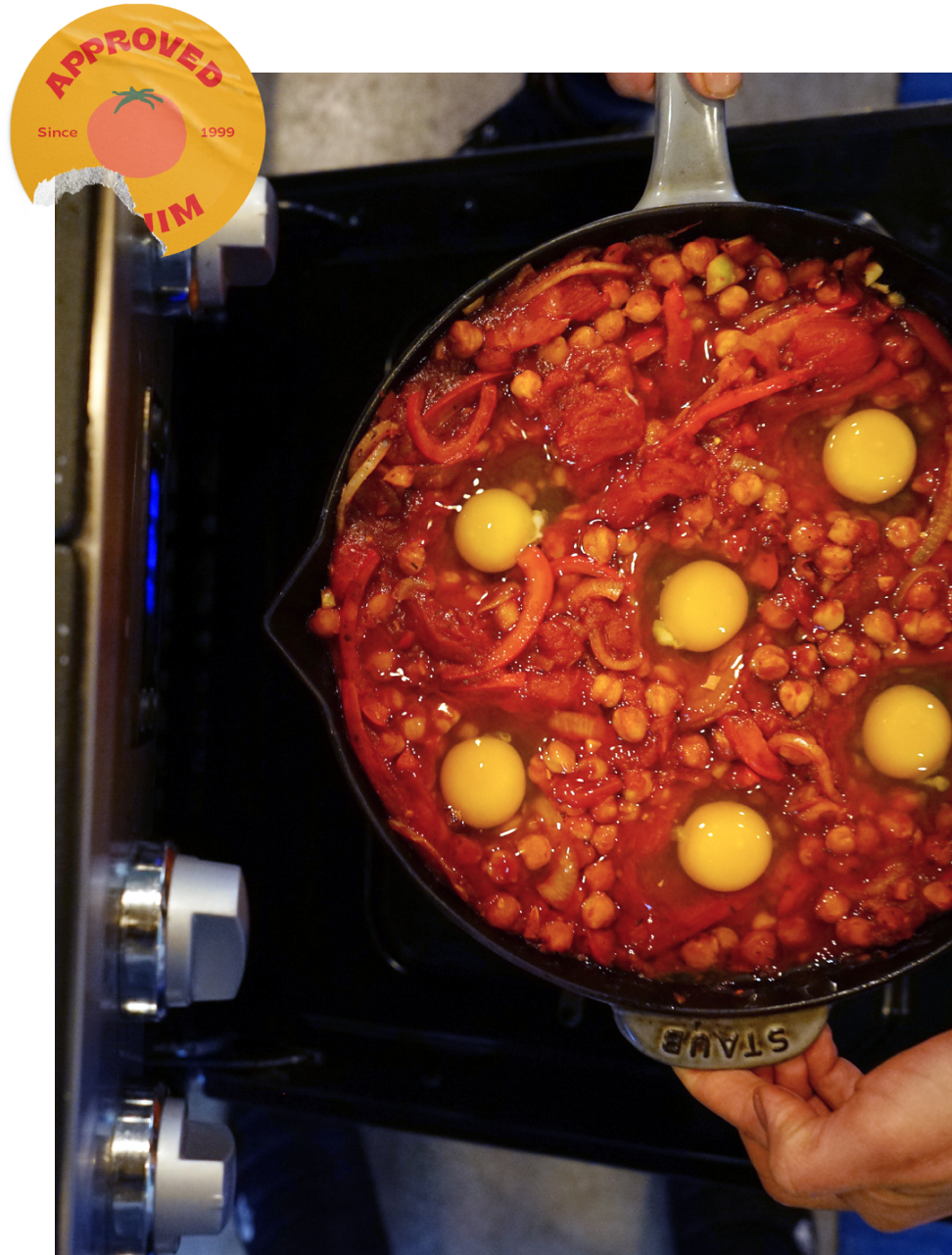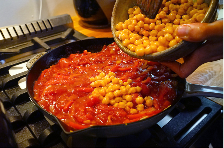 In Israel it’s usually breakfast, but our version of eggs cooked in tomato sauce works for any meal.