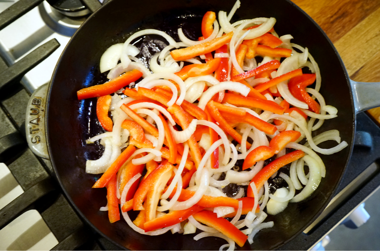 Use a large skillet over medium-low to cook 1 thinly sliced onion and 1 thinly sliced bell pepper in 3 tablespoons of olive oil and a pinch of salt. Cook gently until very soft, about 20 minutes, then add 3 thinly sliced garlic cloves, 1 teaspoon of cumin, 1 teaspoon of harissa and cook for another minute.