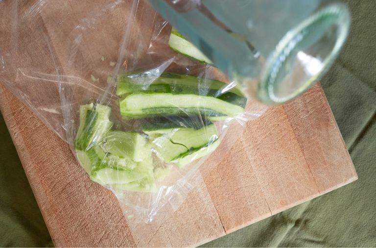 Trim any stems from the cucumbers, place them in a plastic produce bag, and smash them with something heavy (a small cast iron skillet, rolling pin, empty wine bottle, or similar blunt force object). Dump the smashed cukes onto a cutting board and use a large knife to cut them into bite-sized pieces.