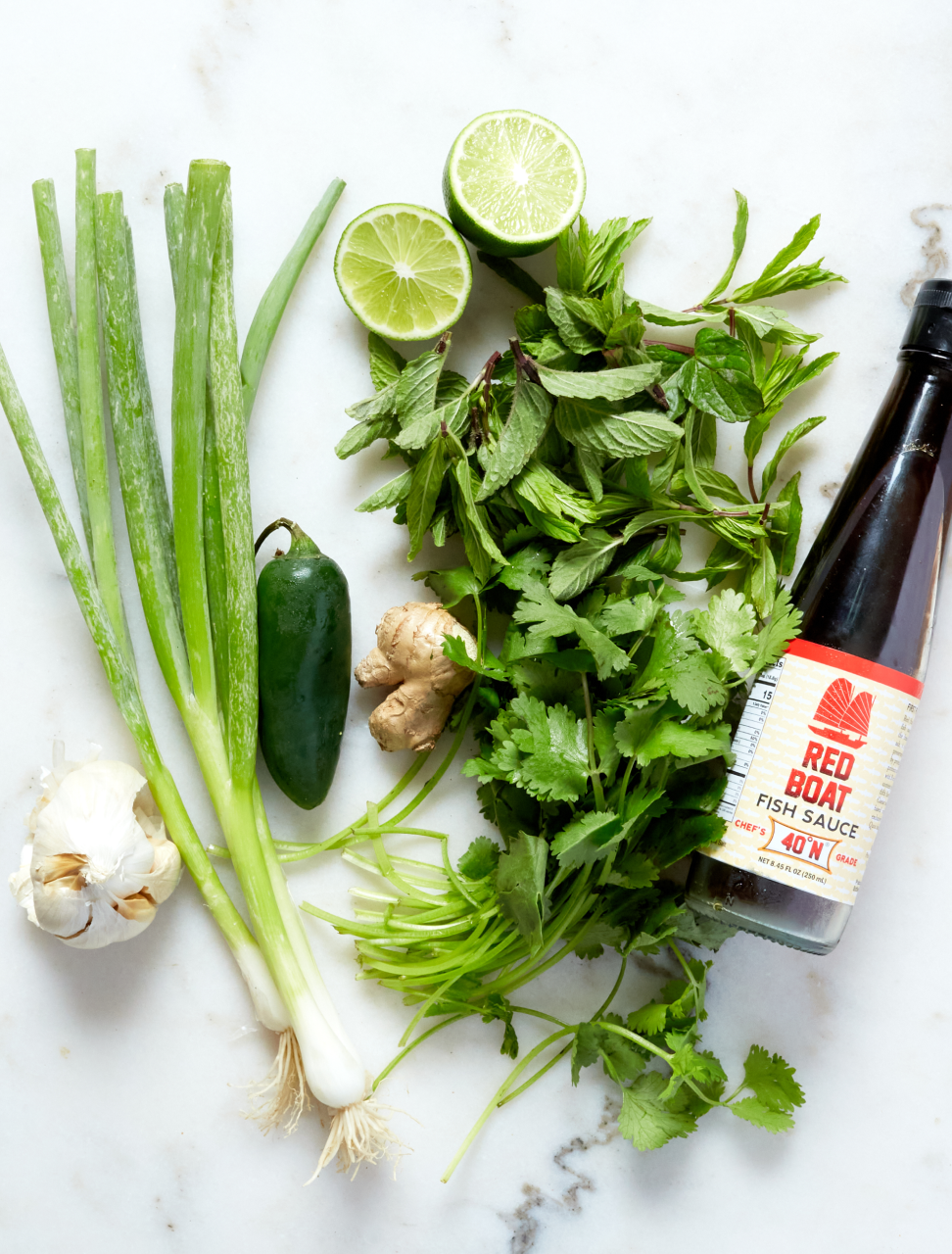 Combine the cilantro, mint, green onions, 1/3 cup olive oil, 3 tablespoons fish sauce, garlic, ginger and jalapeño in a food processor or blender. Pulse until mostly smooth but still speckled with the green herbs, then taste and season with more fish sauce if you like.