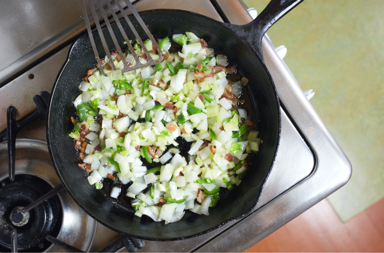 Cook the bacon in a bit of olive oil until lightly browned. Add the onion, celery, and pepper with a good pinch of salt and cook until soft, about 5 minutes.