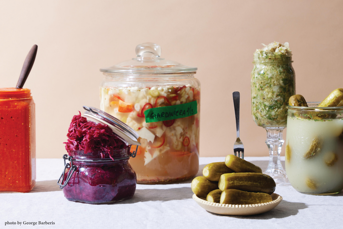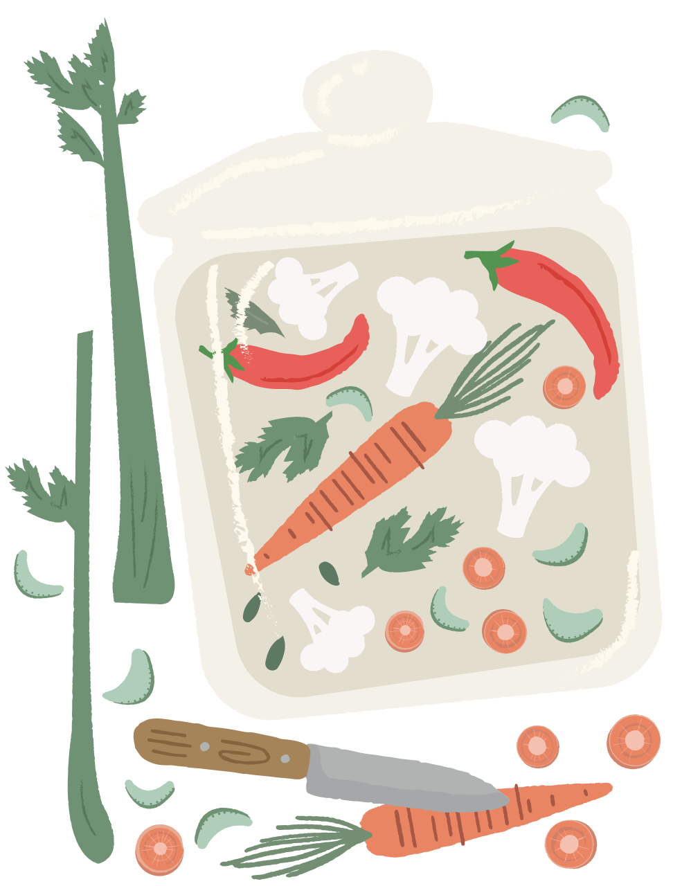 like you find on antipasti platters, but rather than pickling all the vegetables in vinegar, which is definitely the norm, I wanted to ferment ours and also make it fairly spicy. Pretty much all store-bought giardiniera is pickled with vinegar—bracingly salty and sour, with a hint of sweetness. Ours is all that, with some funk thrown in.”