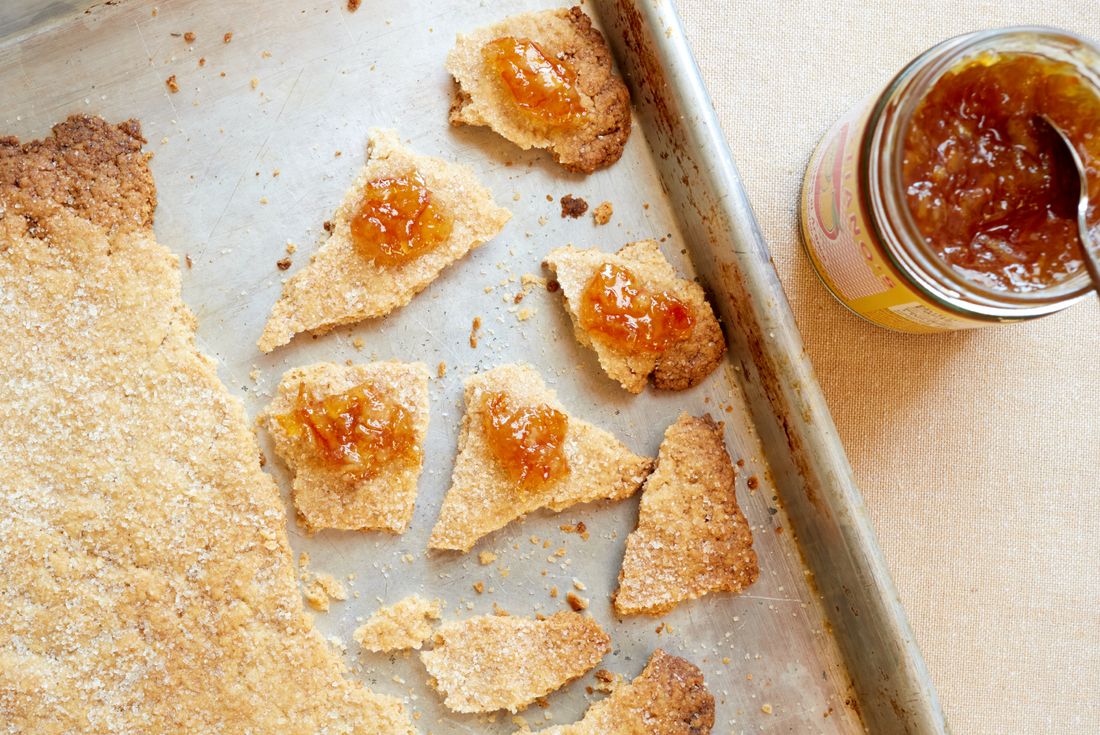 The modern versions use vermouth for a little extra flavor, and it’s worth searching out good whole wheat flour since it also improves the taste. The ingredients mix in the food processor, and you press the dough onto a baking sheet by hand, so it’s quick and easy to make. I like to eat stroscia plain with coffee, or sometimes with a little dab of jam. It’s also good crumbled onto yogurt or ice cream.
