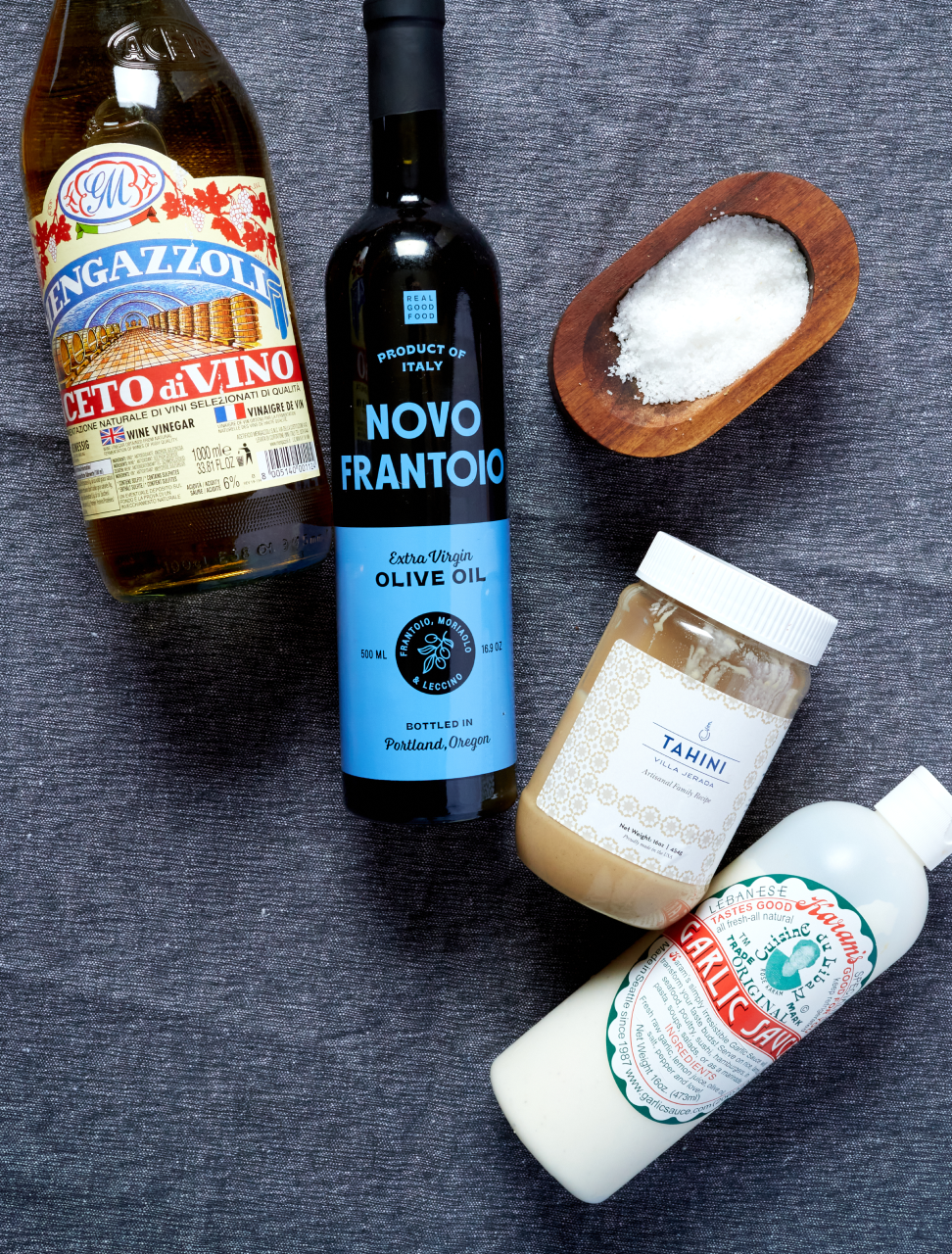 Mix in 2 tablespoons garlic sauce, 2 tablespoons olive oil and 2 tablespoons vinegar.