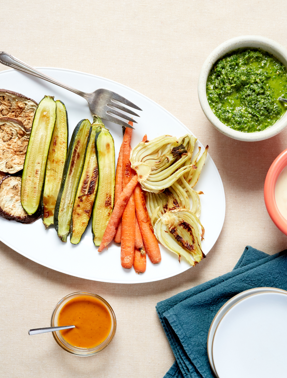 Roasting a bunch of vegetables makes a dinner party easy, but the real hosting superpower is serving them alongside a trio of sauces. Stir a few pantry items together for one, open a bottle for another, and throw some herbs and other stuff in the food processor for the third.