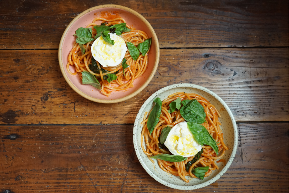 Plate in 4 bowls or one large bowl. Cut each burrata in half, place on top of the pasta. Drizzle generously with olive oil, and scatter the reserved basil leaves over the top.
