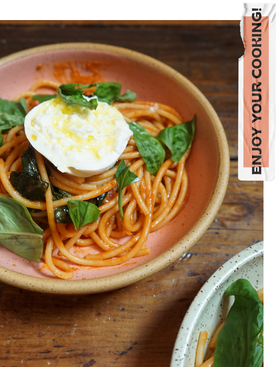 Add the pasta and reserved water to the pan with the tomato sauce. Cook on high heat for about 1 minute to coat the pasta with the sauce. Turn off the heat and add the parm, a drizzle of olive oil, and the picked basil, reserving a few leaves to garnish.