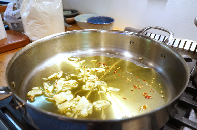Put 1/4 cup olive oil, sliced garlic, and arbol chili in a large pan big enough to hold all the pasta once it’s cooked. Put on high heat. Once it begins to sizzle, turn it down to medium heat and cook for about 30 seconds more. Stir often, you do not want the garlic to brown at all. Once the garlic and chili have bloomed in the olive oil, add the canned tomato. Continue cooking on medium heat until the tomato is cooked down, thick, and rusty colored.