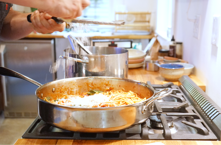 Meanwhile, boil the pasta according to the package instructions. When the pasta is cooked, drain, reserving a 1/2 cup of the cooking water. Add the pasta and reserved water to the pan with the tomato sauce. Cook on high heat for about 1 minute to coat the pasta with the sauce. Turn off the heat and add the parm, a drizzle of olive oil, and the picked basil, reserving a few leaves to garnish.