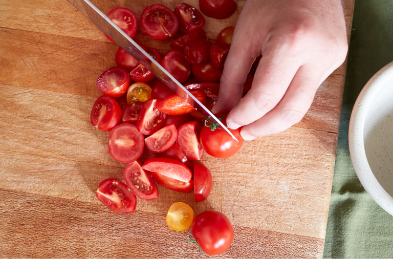 Halve the cherry tomatoes lengthwise and place in a medium bowl.