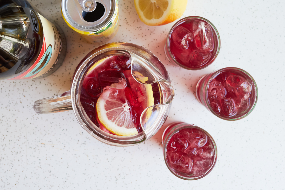 Step 3 — Add 8oz red wine, 6oz sparkling water, and 6oz Limonata soda. If making a Tinto de Otoño, add 4oz red vermouth.