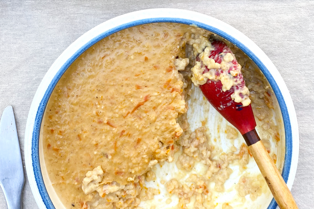 Start by grating a winter squash. It can all be grated with the skin on, but the flinty hard skin of butternut squash must be removed. A food processor makes grating much easier.