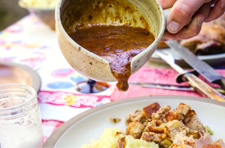 The gravy should be thick enough to coat a spoon, but thin enough to pour. If it’s too thick, add a little more water. If it’s too thin, make another small batch of roux, and stir in some of the gravy before adding it back to the pot.