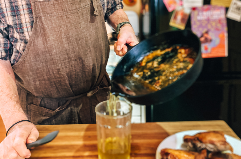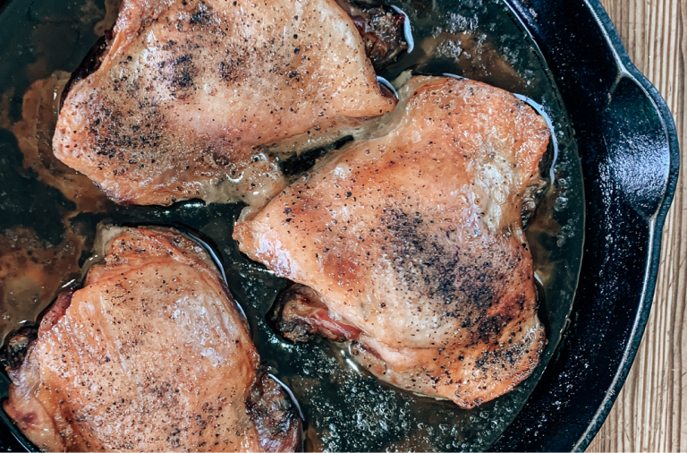 Use tongs to move the thighs from the skillet to a plate. Pour the olive oil, now rich with meat juices, into a tall, heat-proof container. As it cools, the oil and juices will separate and can be used for gravy or to cook vegetables.