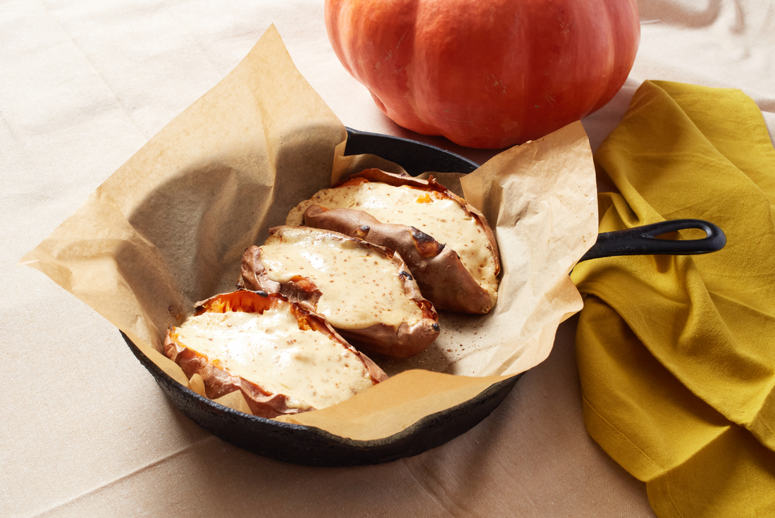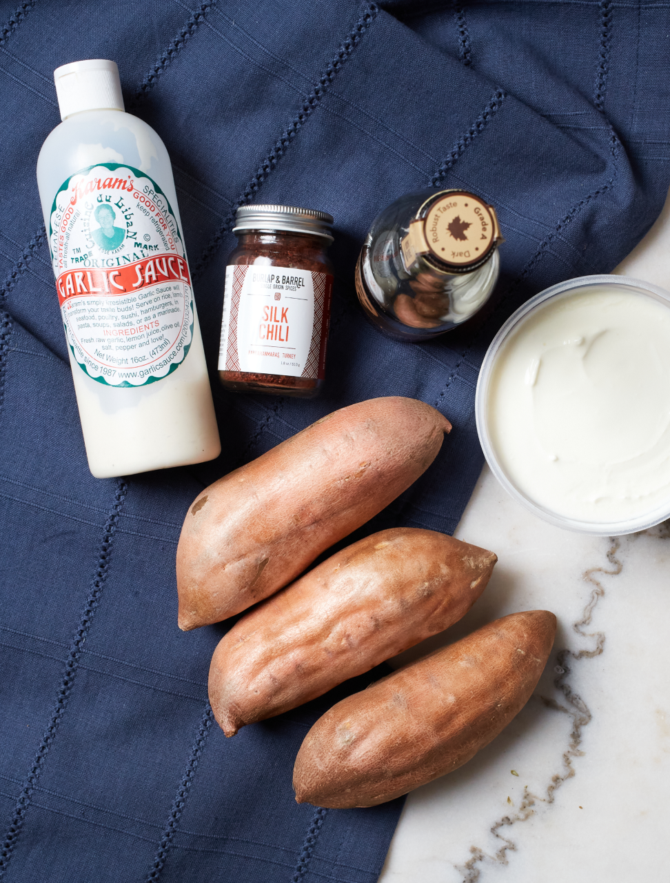 But I never liked the marshmallows on top, and the syrupy glaze made them too sweet. Roasting fresh sweet potatoes makes them pillowy soft, and they’re sweet enough without the brown sugar and marshmallows. I wanted to acknowledge the visual appeal of the original orange and white dish, so I created a garlicky yogurt sauce with spicy and sweet flavors that tastes as good as it looks.