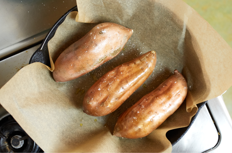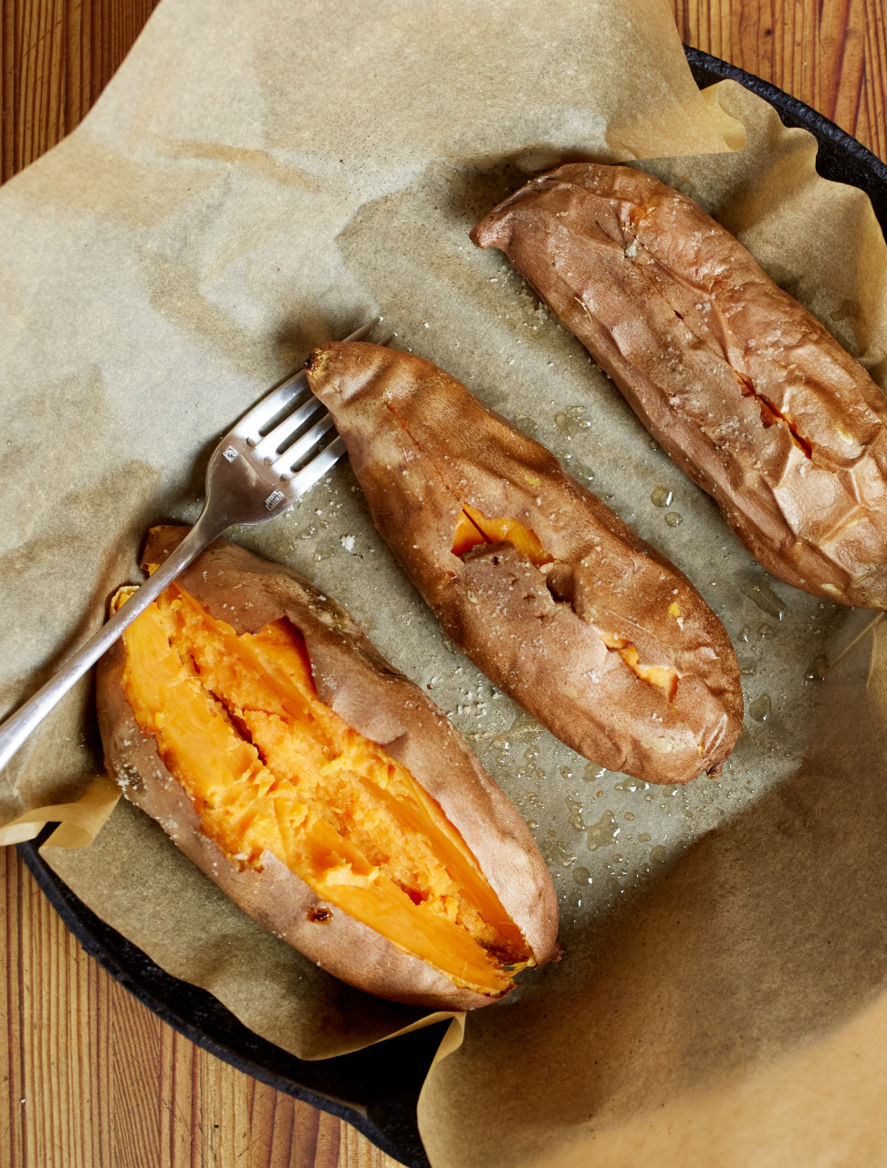 Line a skillet or baking dish with parchment paper. Scrub the sweet potatoes and rub them with 1 tablespoon of olive oil over the baking dish and sprinkle them with the sea salt. Cook in a 400F oven for 45-60 minutes. Remove and let cool slightly.