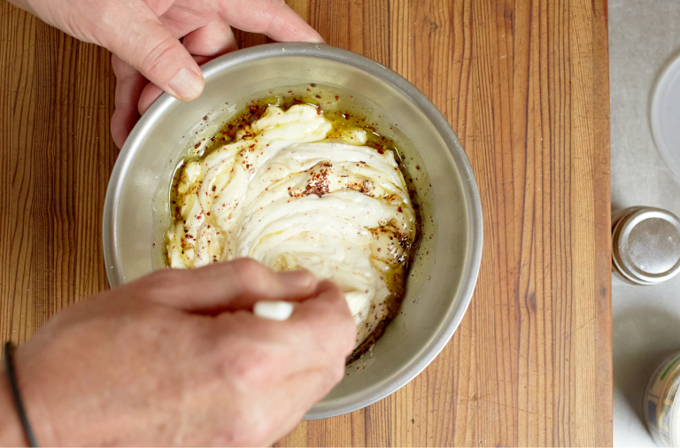 In small bowl combine 1 1/2 cups of yogurt, 1/4 cup of maple syrup, 2 tablespoons of garlic sauce, and 1 tablespoon of olive oil.