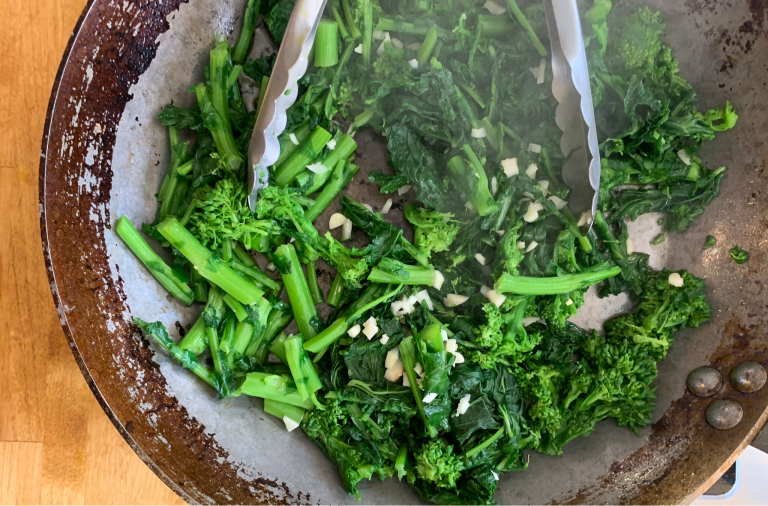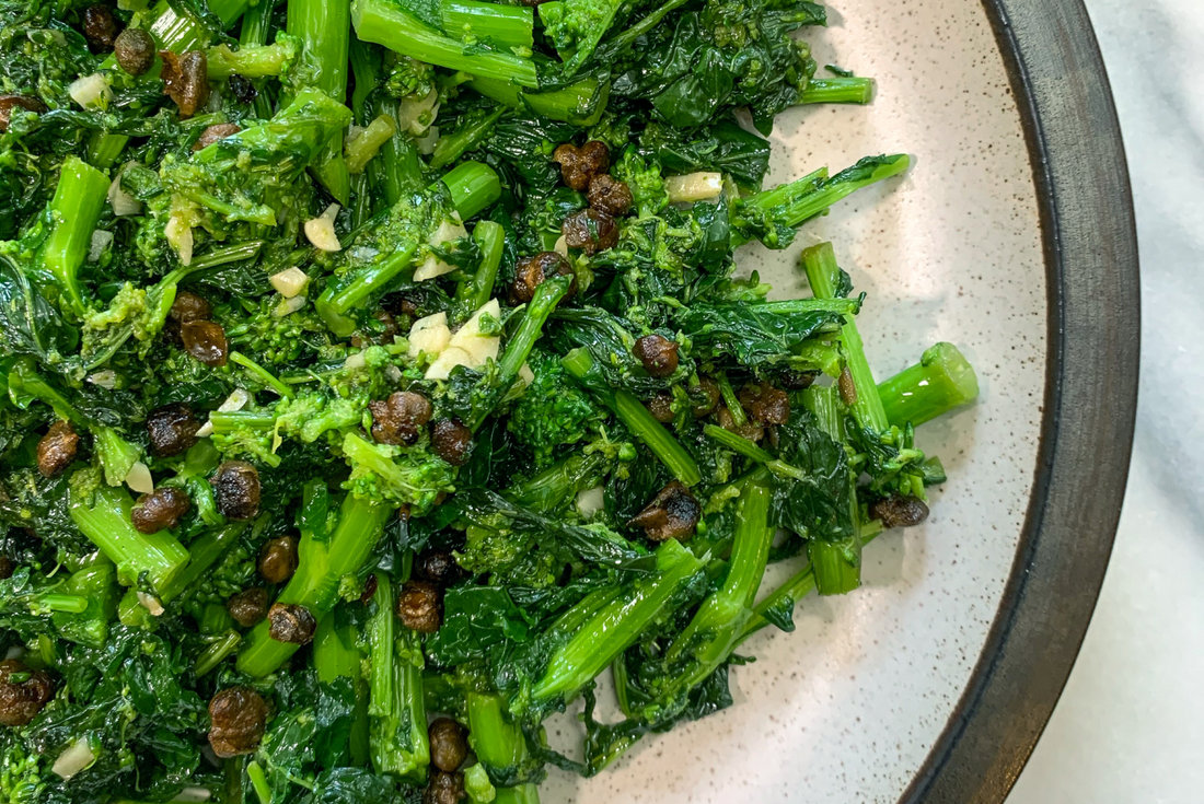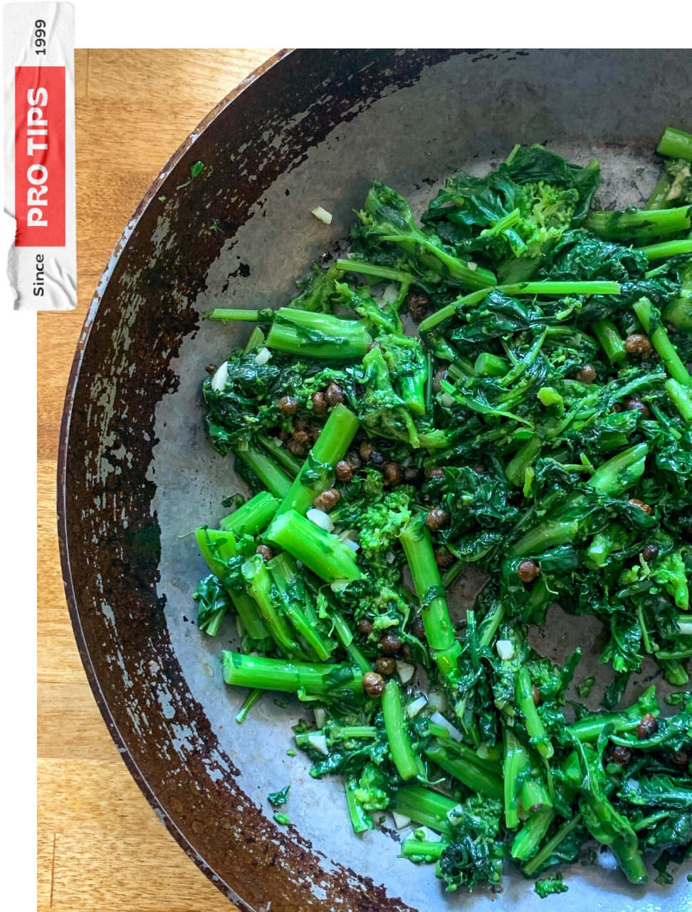 Use a slotted spoon to remove the capers from the skillet and set them aside. Add the rapini (it’s okay if it still got some cooking water clinging to it) and a few cloves of chopped garlic. Cook gently for about 10 minutes, then add the capers and a tablespoon of fish sauce. Taste and add salt if needed.