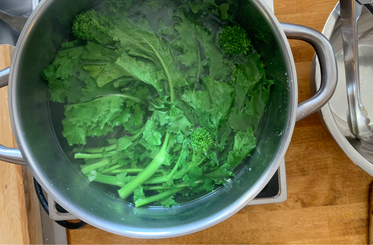After about 2 minutes (that’s 2 minutes total in the water, not after it returns to a boil) set tongs to lift the greens from the pot. You can save the water to cook pasta or vegetables if you want. Let the rapini cool a bit, then cut it into roughly 2-inch pieces.