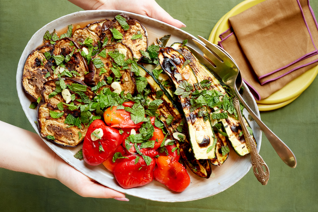 Grill vegetables over direct heat until charred, 5-10 minutes depending on the heat of the grill. Or arrange on sheet pans and roast at 400 until tender, about 15-20 minutes.