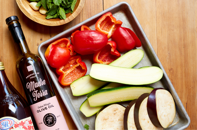 Slice the eggplant into ½ inch thick rounds. Remove the seeds and membrane, then cut the bell peppers in quarters. Slice the zucchini in half lengthwise. If roasting, toss the vegetables in a large bowl with a tablespoon or so of olive oil.