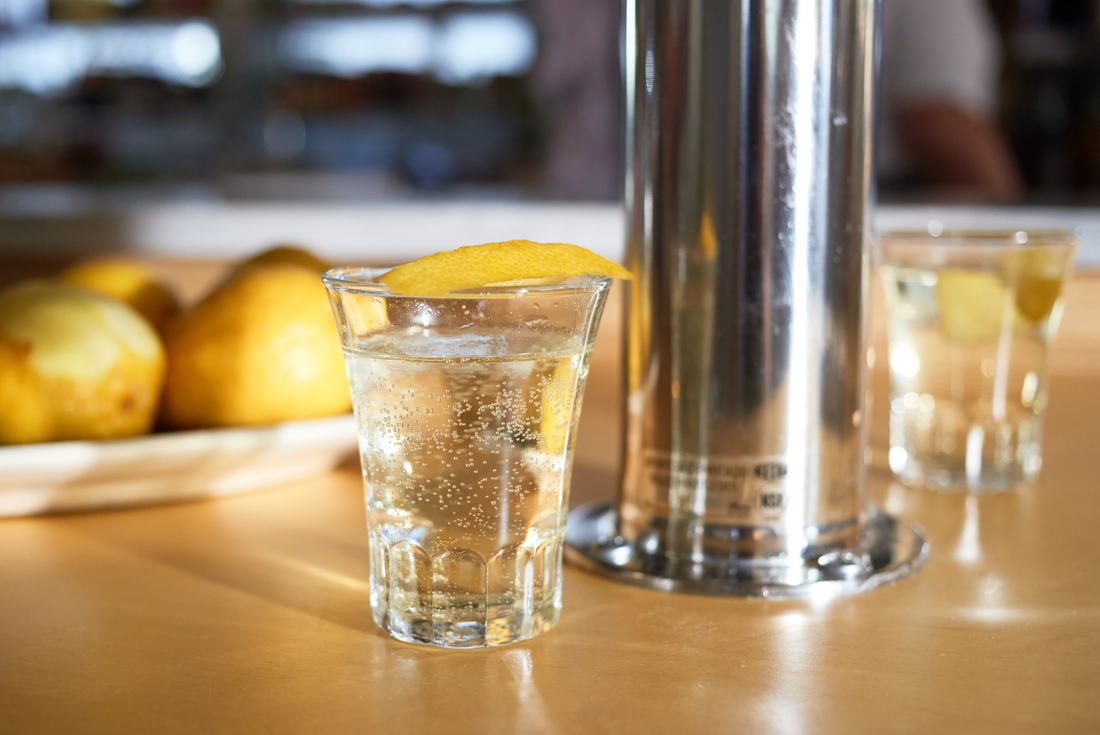 this simple spritz can be made with either sweet or blanc vermouth (blanc vermouth, less well known in the US, is citrus-driven and less sweet than sweet vermouth, but considerably sweeter than dry vermouth). We top ours with a simple lemon twist, but in Barcelona, the customary garnish is a slice of orange and green olives.