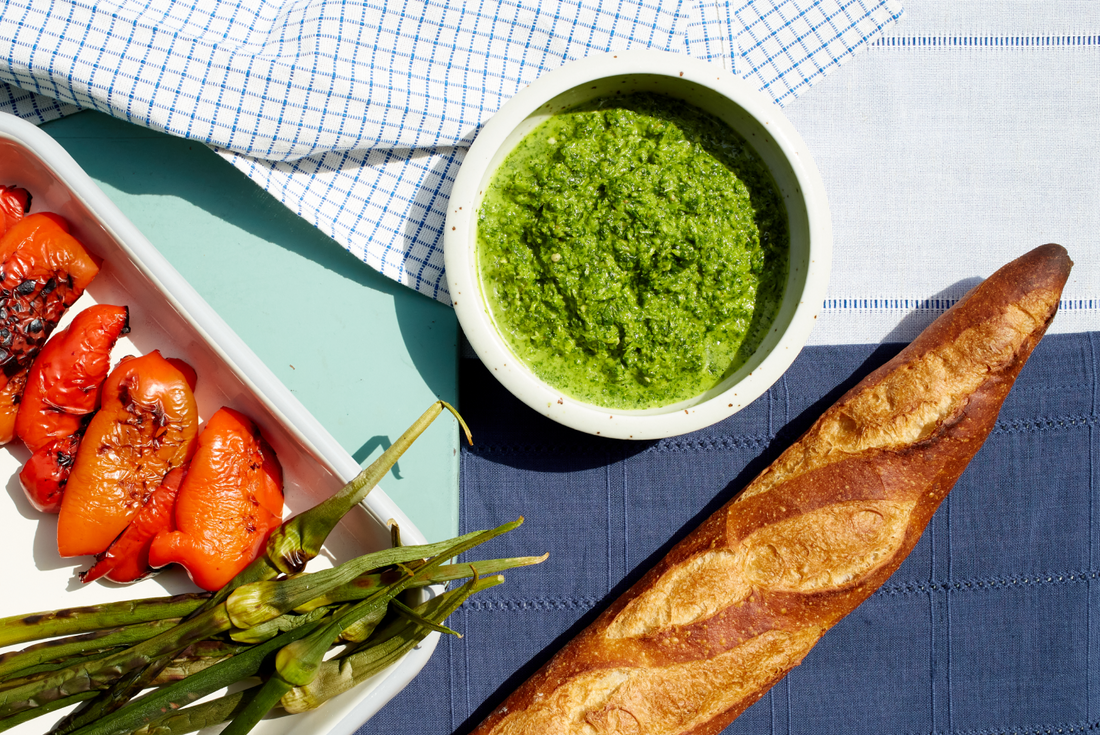 Italian pesto, Argentinian chimichurri, Moroccan chermoula, chile verde from Mexico, and the chile-herb sauces of Thailand. They all share a base of the locally grown fresh herb, a hit of something acidic to brighten the flavor, usually some oil, and most include the spicy bite of chile. If you’ve got herbs in your garden, what our friend Katherine Deumling of Cook With What You Have calls her green pantry, you can make your own, mixing whatever looks good at the moment.