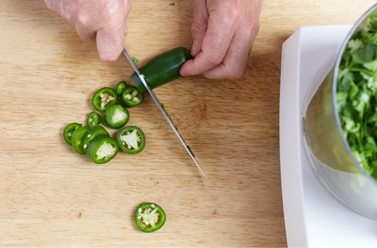 Cut the cilantro, stems and all, into roughly 3 inch pieces (leaving the stems long makes it harder to process). Slice the jalapeños into a few pieces, and peel the garlic cloves but leave them whole.