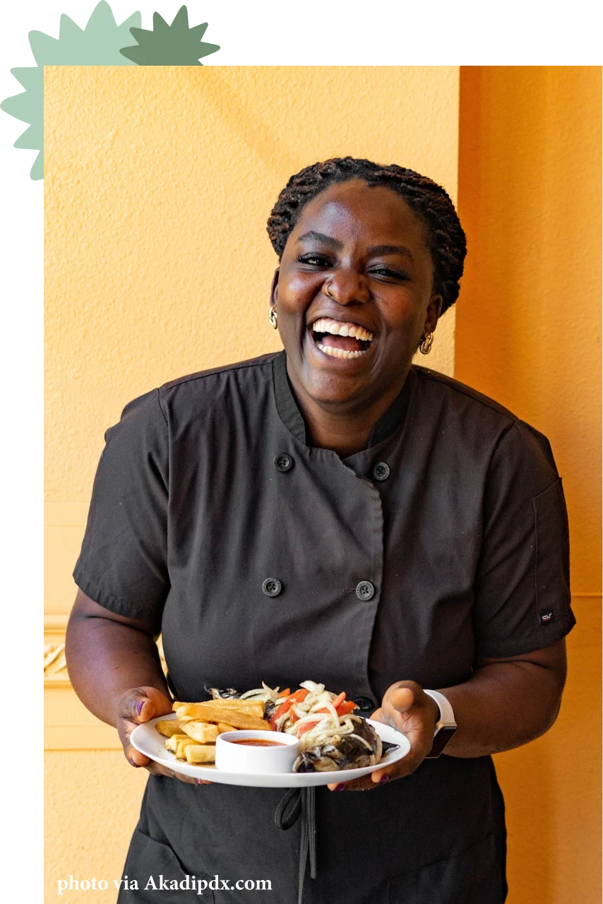 during the West Africa country’s second civil war. After finishing college in Portland and Seattle, she opened her Portland restaurant Akadi in 2018. Local eaters loved her traditional dishes like peanut butter stew and fermented cassava, and Ouattara made her restaurant a welcoming gathering place for the entire African diaspora by featuring regional dishes from across the continent. Live music, grilled meats, and cold beer provided a little taste of home, and Portland diners lined up in droves.