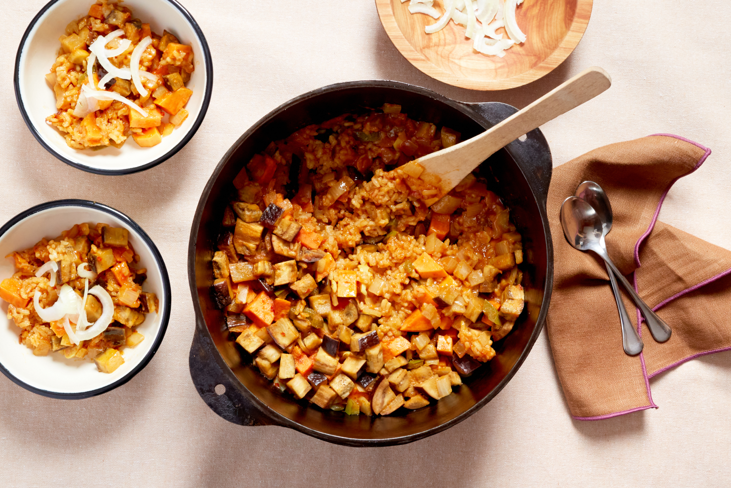 Every rice-eating culture has a “rice with stuff” dish, a bunch of vegetables and other savory bits cooked with the rice in a single pot. In Burkina Faso they call it riz gras, the French term for fat rice, and our version uses Akadi Sauce for an authentic taste of Africa.
