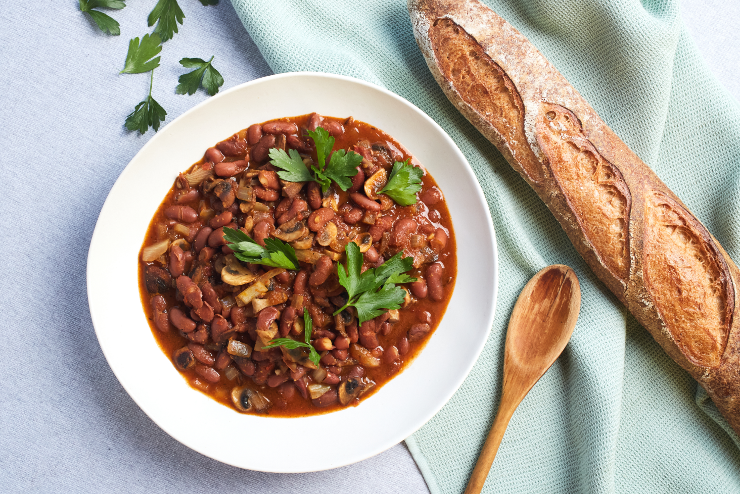 This mushroom chili was inspired by the food in Jim’s 1960’s high school cafeteria. But don’t hold that fact against it; Jim updates the recipe with Akadi Sauce for a West African spin on his old favorite.