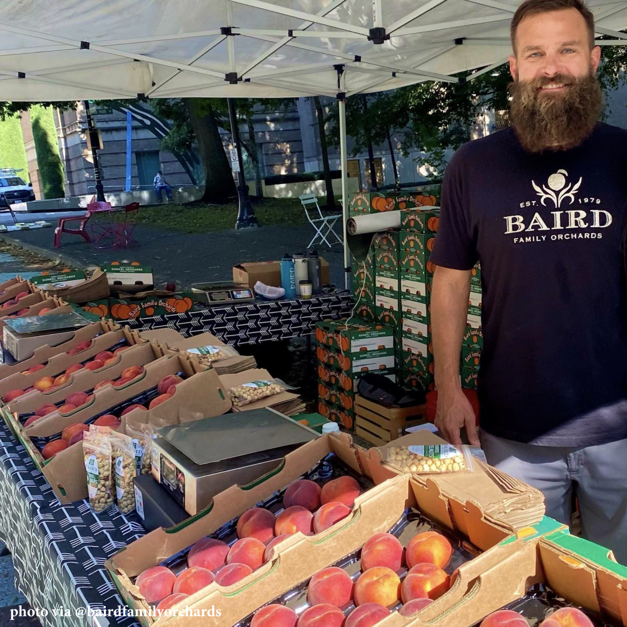 If you’re at the Portland Farmers Market and Trevor Baird offers you a peach sample, take it. It might be the best peach you’ve ever tasted. Unlike farmers who need to pick their fruit before it’s really ripe so it survives the rough handling on the way to the supermarket produce section, the Baird family waits until their peaches are ready to eat. You can’t go back to the hard, green stone fruit trucked up from California once you’ve had the sticky juice from a fat Sweet Sue peach run down your arm.
