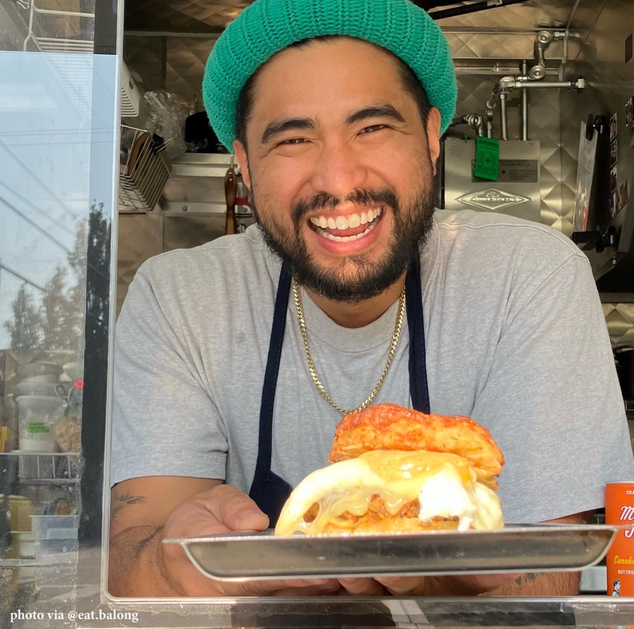 Justin Duaz is quietly making some of the best breakfast sandwiches in Portland. At his cart Balong (Ilocano for “little boy,” and the nickname his grandmother gave him), the San Jose native is turning out savory Filipino-American mashups of childhood favorites, including a deceptively complex potato pave and toast piled high with perfectly scrambled eggs. But the sandwich is the star: house-made sausage, sun dried tomato and garlic aioli, melty Tillamook cheddar and a perfectly fried egg served on freshly baked pan de sal.