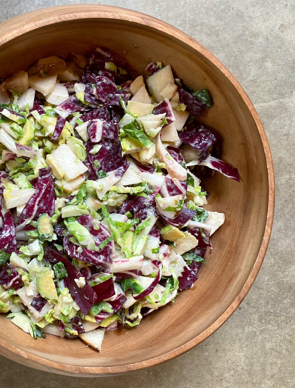 Radicchio, Brussels Sprouts, and Pear Salad with Creamy Caesar Dressing
