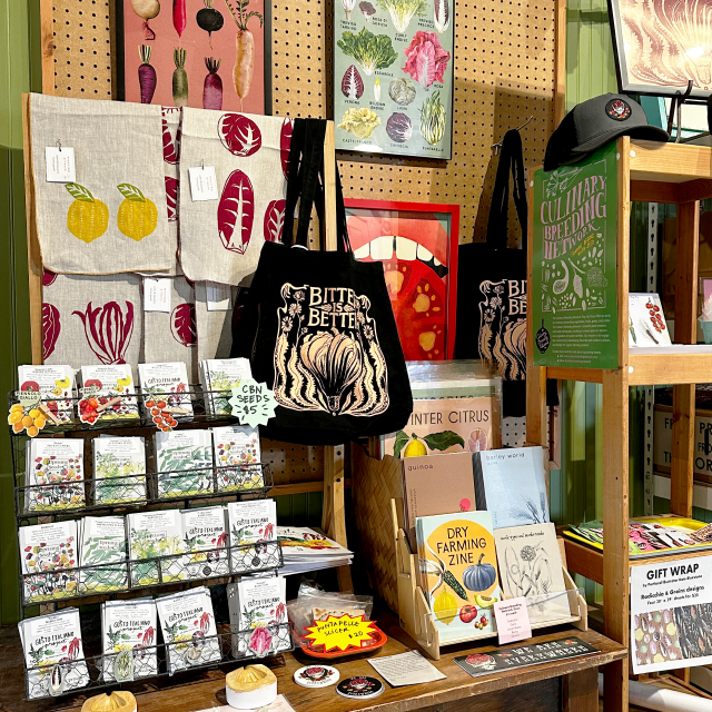 Now, the collaboration continues with a CBN pop-up shop tucked inside Wellspent Market. It’s a colorful, produce-loving corner filled with Bitter is Better totes, limited-edition zines, enamel pins, stickers, tagliapuntarelle (puntarella cutters!), and a curated seed collection.