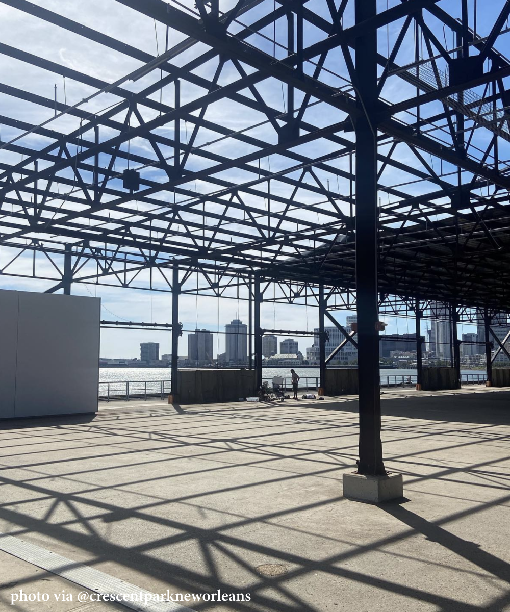 Just downriver from the French Market, Chartres Street veers off from Esplanade, and a stair tower (with an elevator) goes up to a skybridge across the railroad tracks that still serve the active wharves nearby. Down the other side is Crescent Park, a sliver of reclaimed industrial river bank that lets you get close to the Mississippi. Freighters pass long barge tows on the wide, brown, and fast-moving expanse, you can see Algiers on the other side, and the big river is both fascinating and humbling.