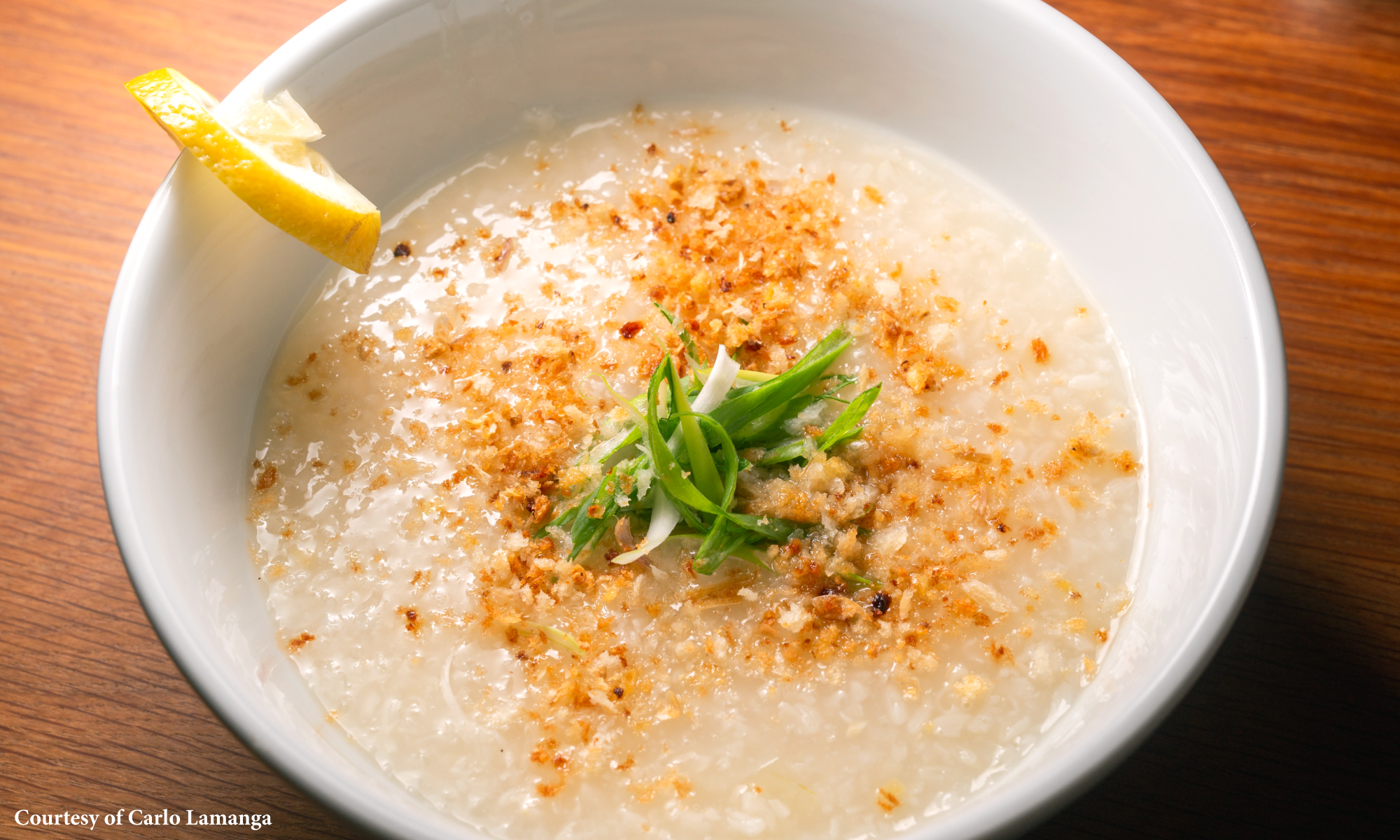 5. Serve the arroz caldo in bowls, garnish with sliced green onions, fried garlic, and lemon wedges.