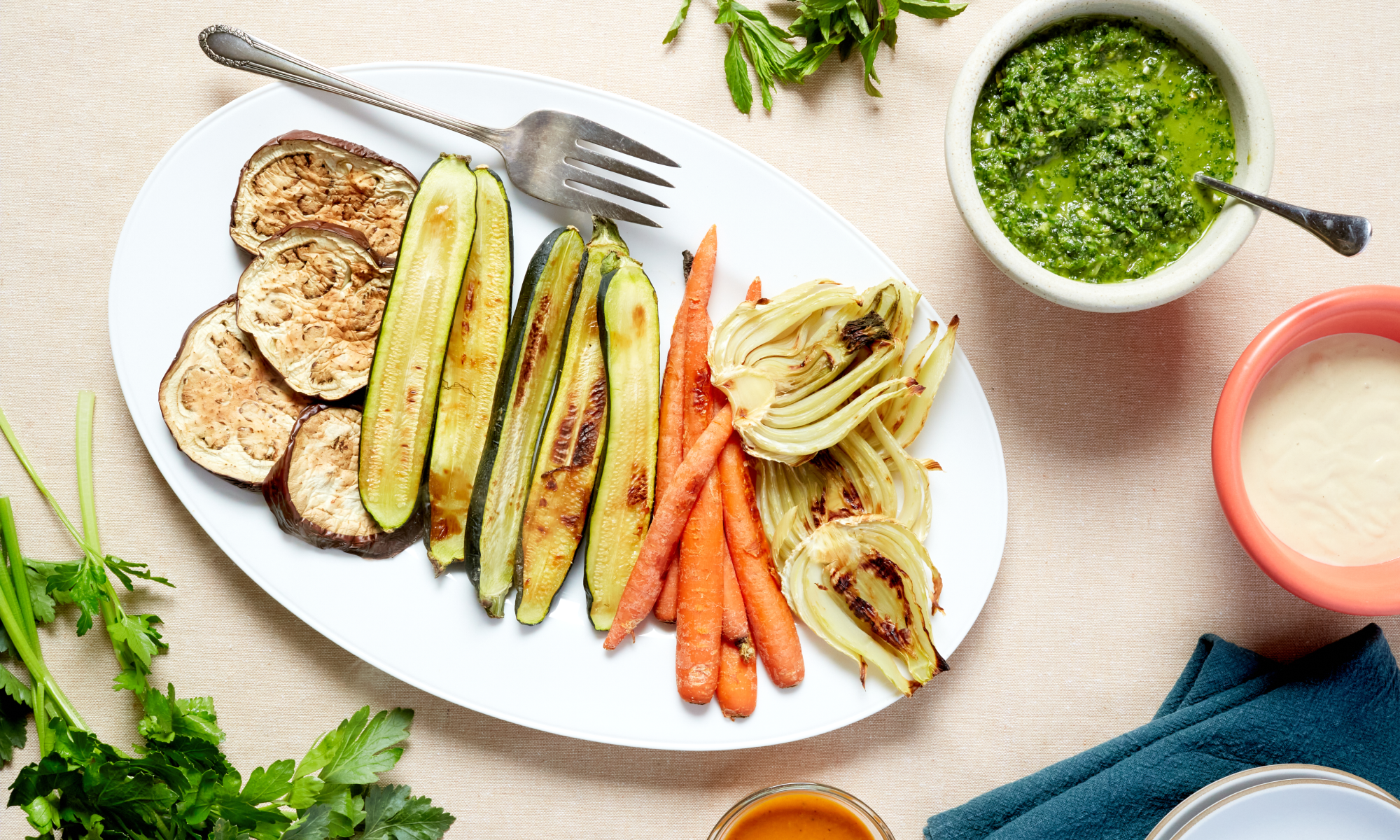 Here’s one of my secrets for a dinner party: make a big platter of roasted vegetables with a few sauces. They’re relatively cheap, you can get the prep and cooking done hours before the guests arrive, they’re very tasty, and everybody should eat more vegetables. And while sometimes all they need is a drizzle of olive oil and sprinkle of flaky salt, a trio of sauces provide even more flavor and impress the guests, too.