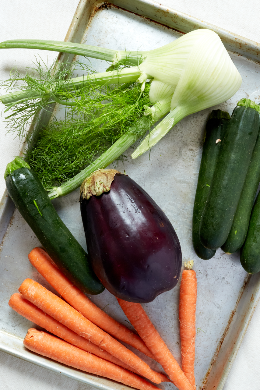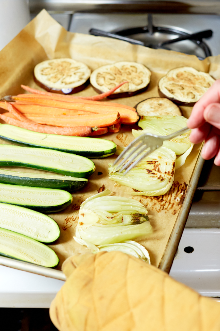 Spread everything onto a sheet pan or two (use parchment paper for even easier cleanup) and roast at 400F for 10-15 minutes. Flip the vegetables over and roast for another 10 minutes or so. Transfer to a platter and let them sit while you make the rest of the meal; roasted vegetables are best at room temperature.