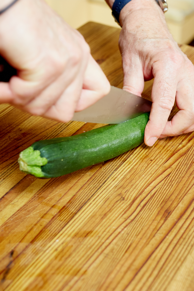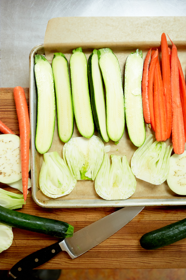 I almost always include zucchini. It’s widely available most of the year, and even better during the summer when I can shop at the farmers market for varieties like romanesco, with its hexagonal cross section, or other summer squash such as patty pan or yellow crookneck. Whichever you have, slice them in half from the stem to the blossom end. Do the same thing with carrots.