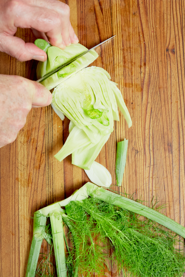 For a sense of the exotic, I’ll include fennel. It’s mild, anise-like flavor gets more subtle and mellow with roasting. Trim the stalks and fronds (the stalks can go into vegetable stock, the thin fronds can be chopped and sprinkled over the fennel after it’s roasted), then cut the bulb into slices from top to bottom. The ends pieces will be small and irregular, but roast them too.
