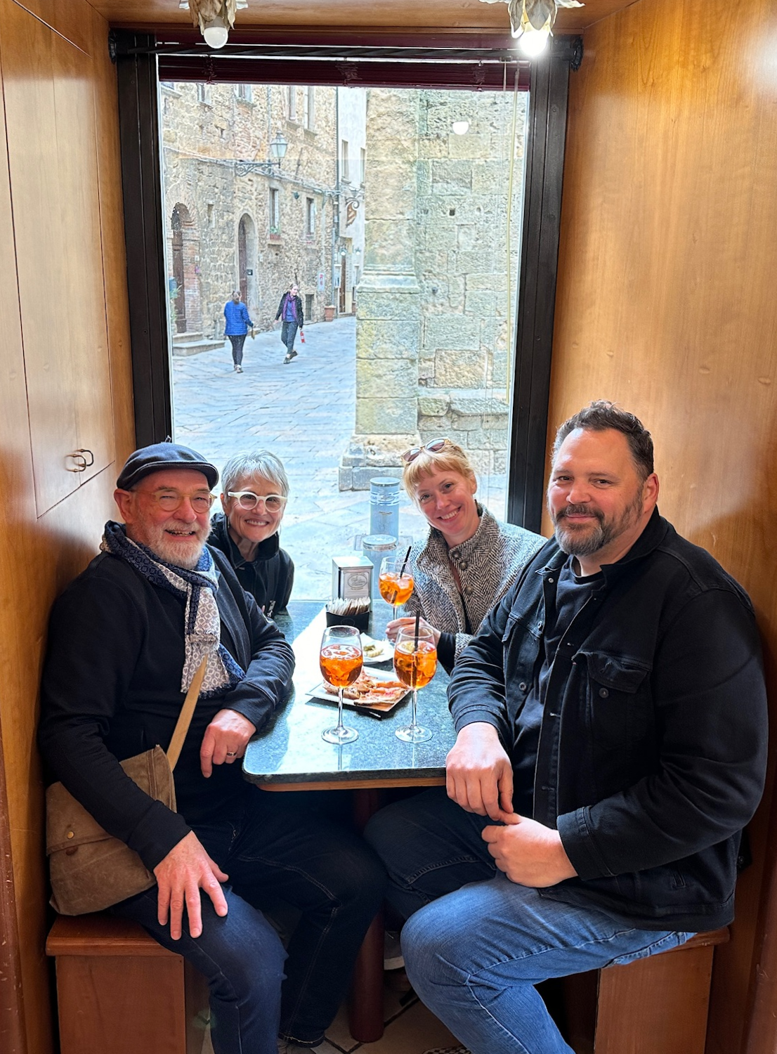 Jim, Judith, Noah and Kate are in Tuscany visiting the Nenna family at Novo Frantoio. Daughter Sabina runs things these days, managing the family's on-site agriturismo as well as the organic, 200 year old olive grove. Her father Giuseppe started farming this land over 30 years ago, building the family's first olive press himself. Sabina welcomed our travel-weary gang with a home cooked meal in the agriturismo's restaurant, and the fearsome foursome will spend the next few days with the family touring the groves and basking in the Tuscan sunshine before heading off to Umbria. Buon viaggio!!