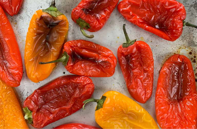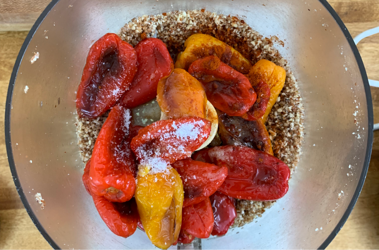 While I’ve blackened and peeled dozens of red bell peppers to make this sauce, these days I take a simpler approach. Start with a 1 lb bag of mini sweet peppers. Spread them on a sheet pan, roast at 350F for about 30 minutes, and pull off the stems when they’re cool enough to handle.