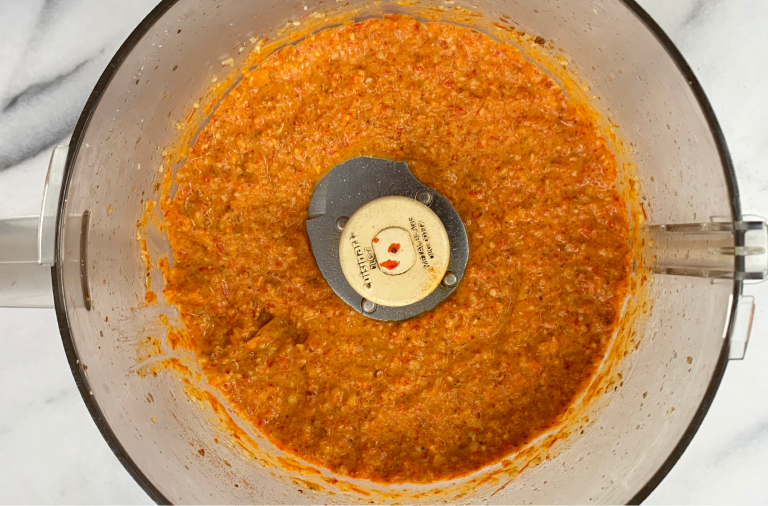Process until you get a smooth paste, tasting and adding more olive oil, vinegar, and salt if needed. I like my romesco-adjacent sauce a little thick, more like a dip.