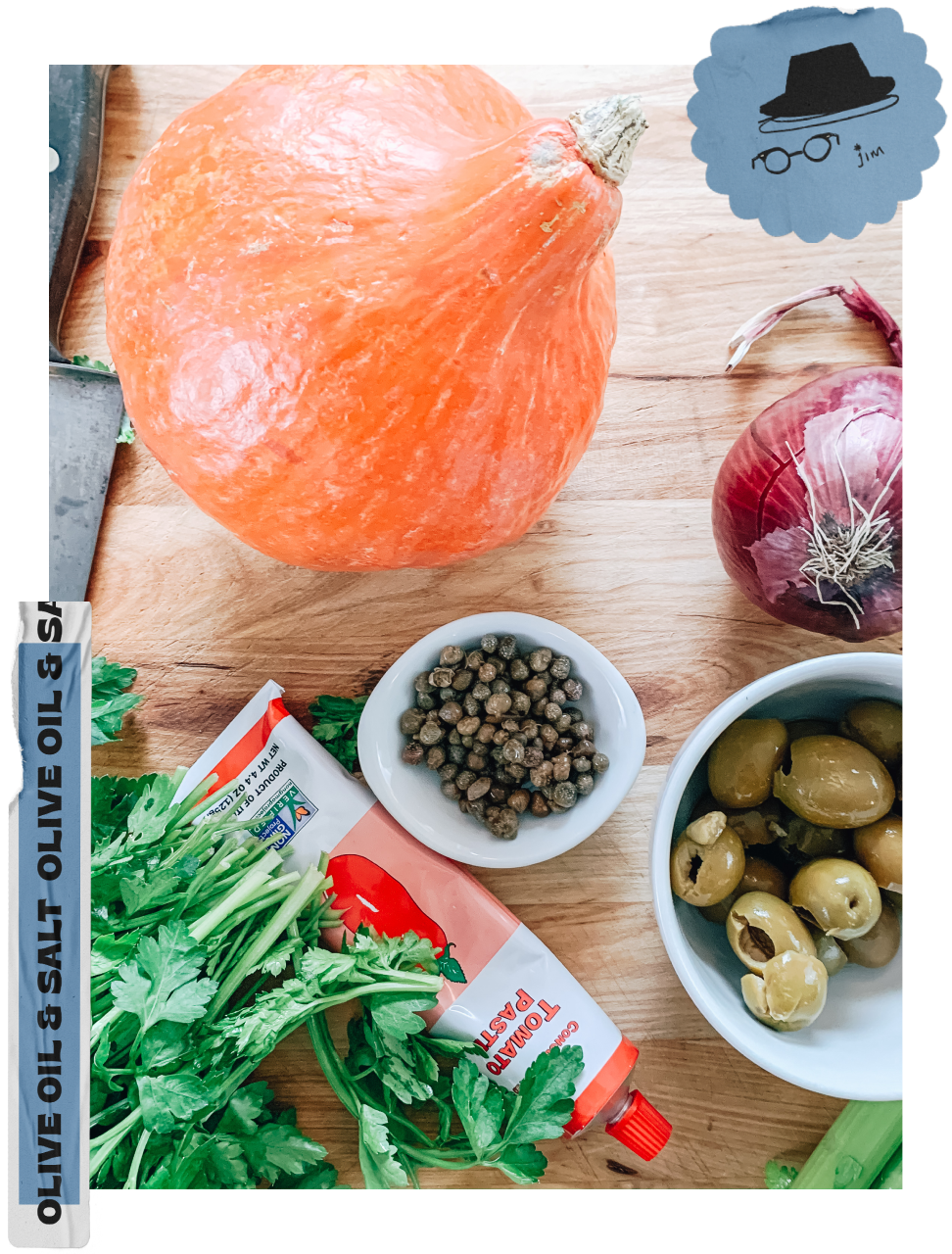 While the squash bakes, soak a couple of tablespoons of Pantellerian salted capers in cold water for about 15 minutes, then drain.