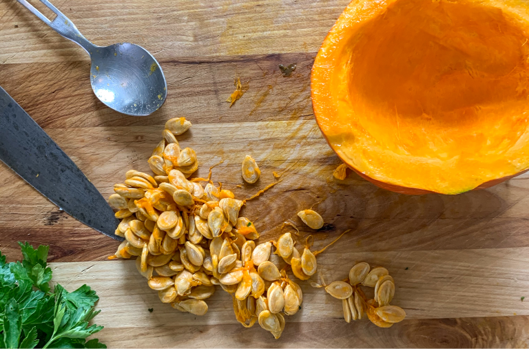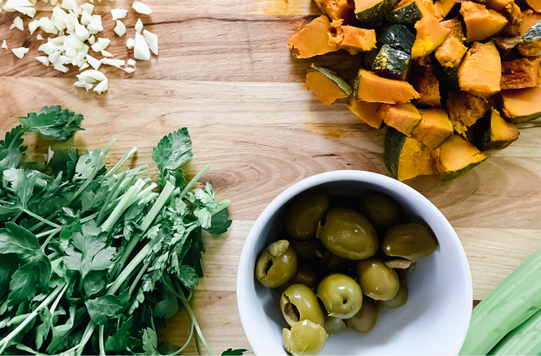 I think the big, pumpkiny varieties taste better, but you can make this with any winter squash. Cut it into roughly 3/4 inch chunks; you want about 3 cups. Drizzle with olive oil and bake at 350F for about 25 minutes or until tender.